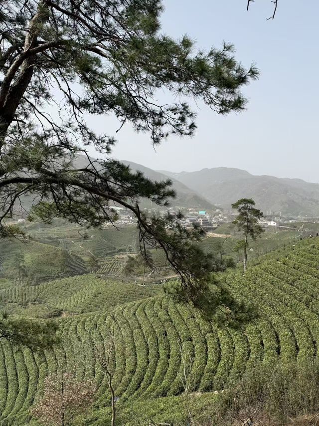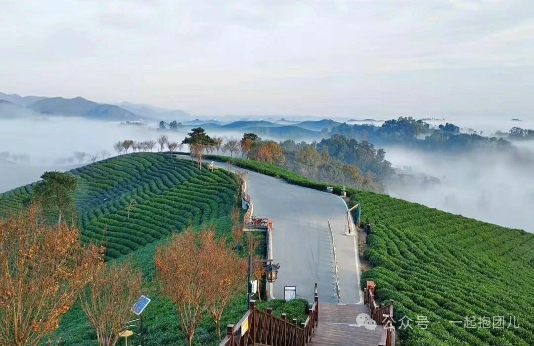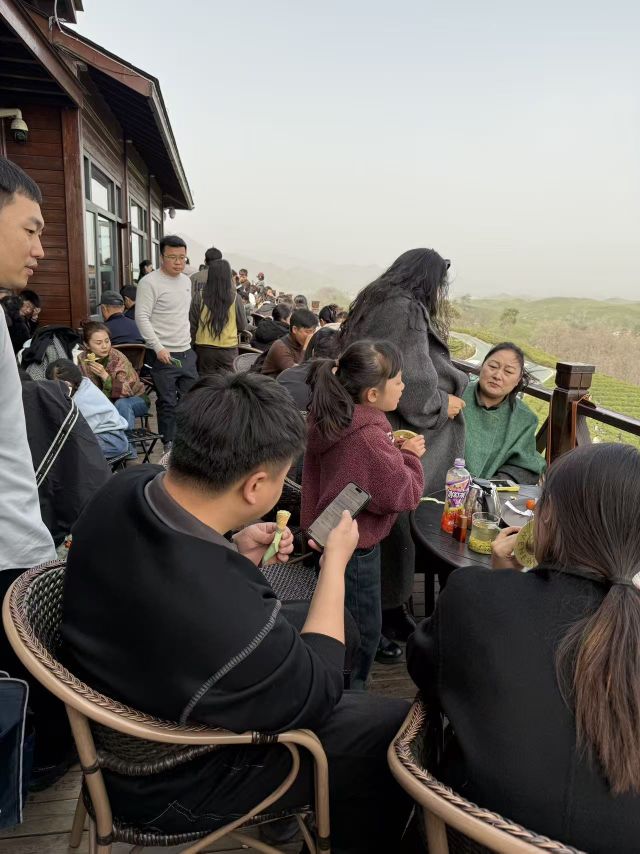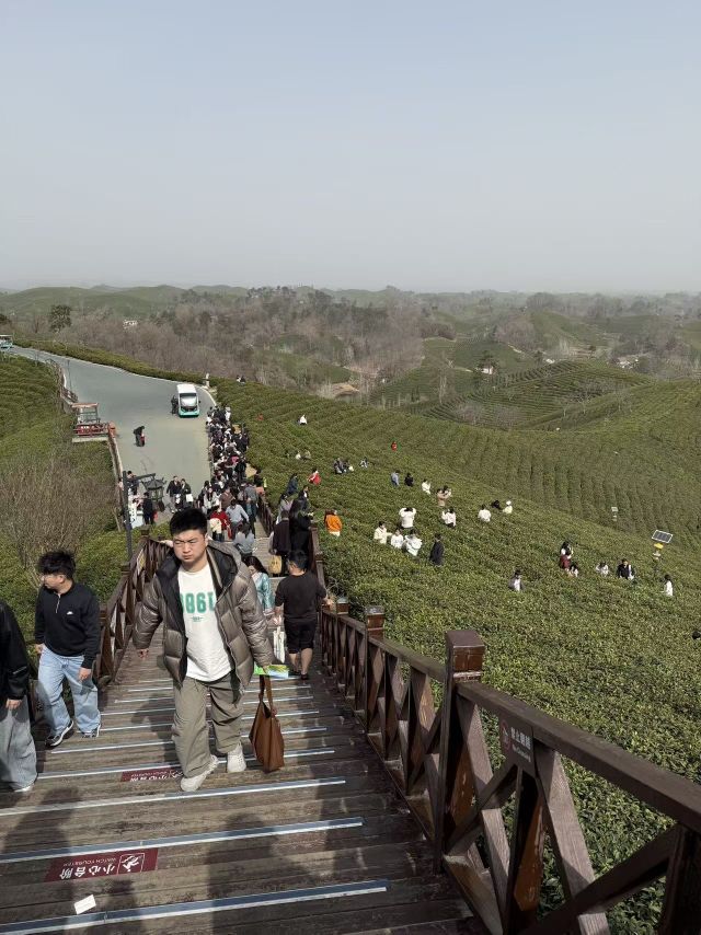 通往山顶的步行道上,行人宛如一条灵动的长龙,蜿蜒舞动。老人们拄着登山杖,步伐稳健而从容;有娃娃们骑在父亲的肩头,兴奋地挥舞着小手,好奇地张望着四周;年轻情侣们手牵着手,脸上洋溢着幸福的笑容,欢声笑语在山间回荡。当我们终于登顶,极目四望,才恍然大悟这汹涌人海的缘由——茶山连绵起伏,如浩瀚无垠的海洋,一垄垄茶树顺着山势层层铺展,宛如大地隆起的绿色波浪,一波接着一波,涌向远方。无论是远道而来的外地游客,还是近在咫尺的本地居民,此刻都站在这片茶海之上,俯瞰着山下的车海与人海,感受着这独特的壮观景象。